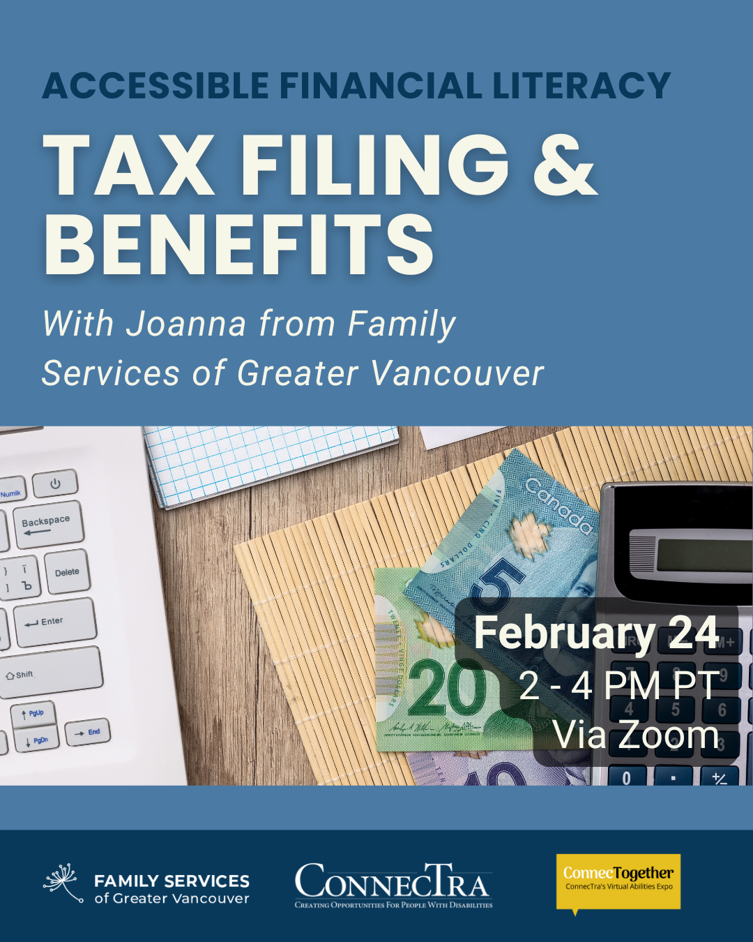Are you interested in learning more about what tax benefits and credits can help support you and your family? Want to prepare for the upcoming tax season? Join Joanne from Family Services of Greater Vancouver on February 24th, 2 – 4 PM PT, for an accessible workshop on the tax filing process.